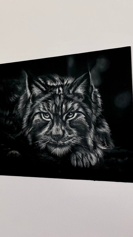 My smaller-scale realism animal portraits are a celebration of nature's beauty. I strive to capture the unique spirit and beauty of each creature, from the majestic lynx to the tiny cute bee. Through the use of white acrylic on black background I strive to create portraits that are both realistic and expressive.