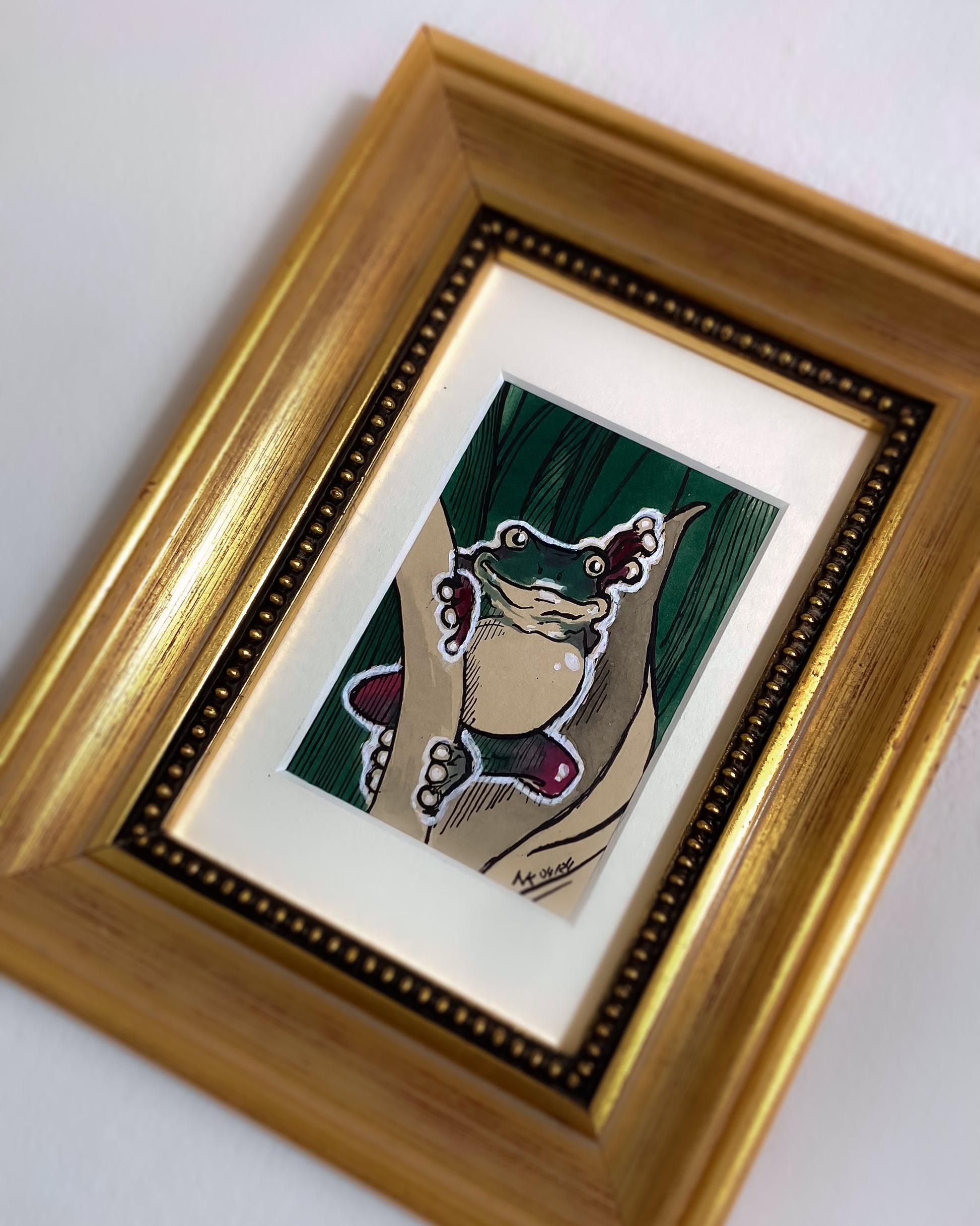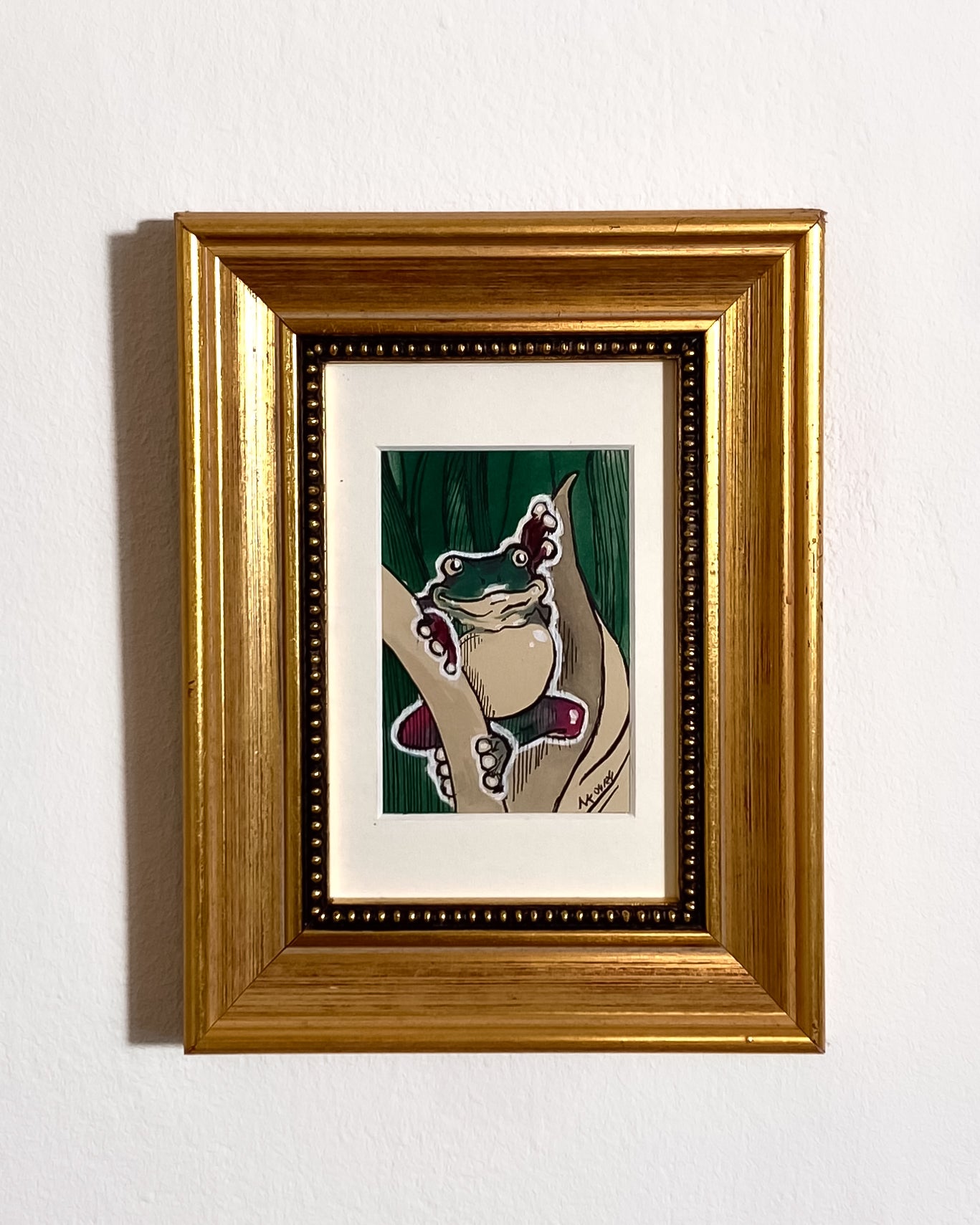 Calligraphy pen with acrylic and water-based ink on tan paper, vintage frame