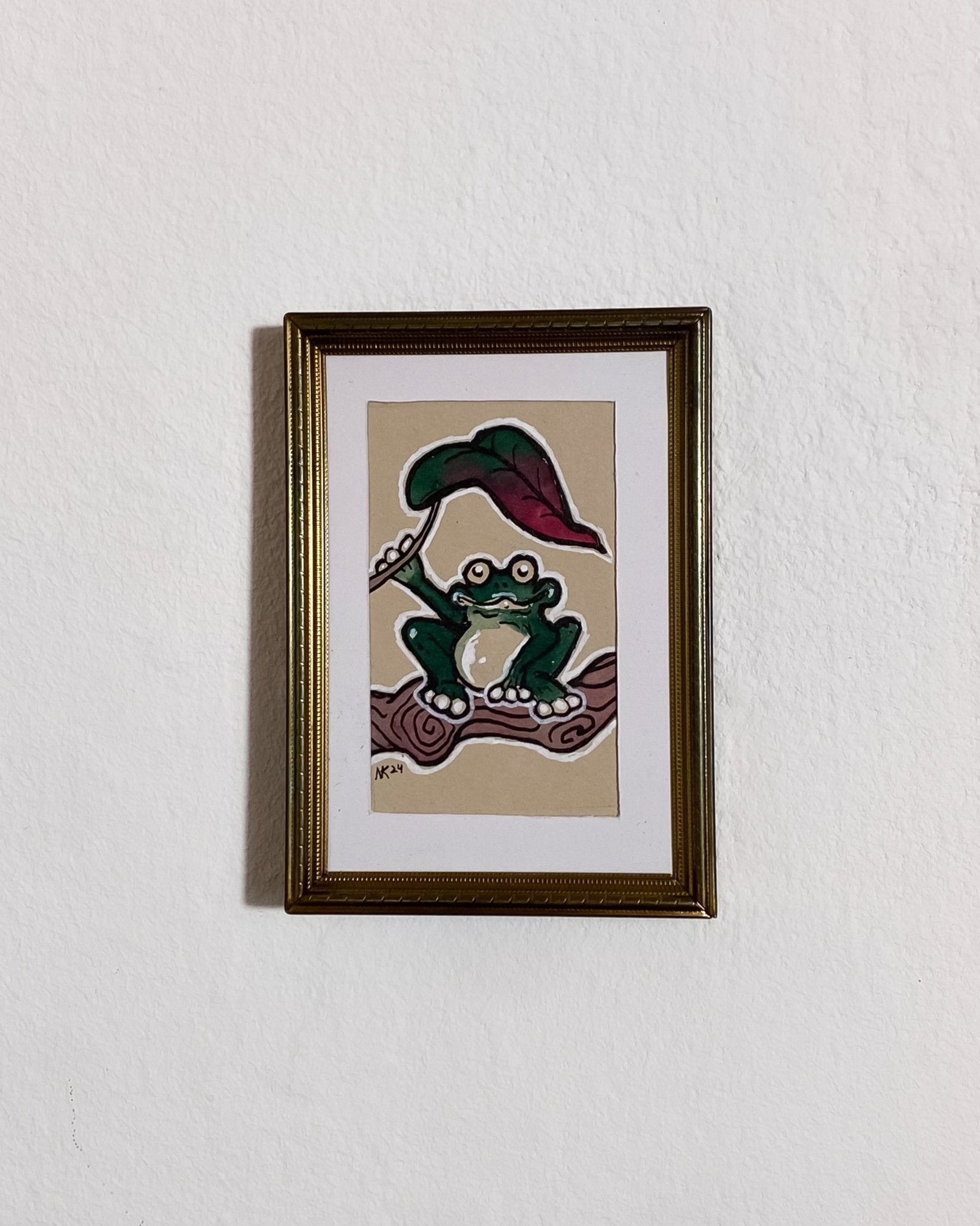 Calligraphy pen with acrylic and water-based ink on tan paper, vintage frame