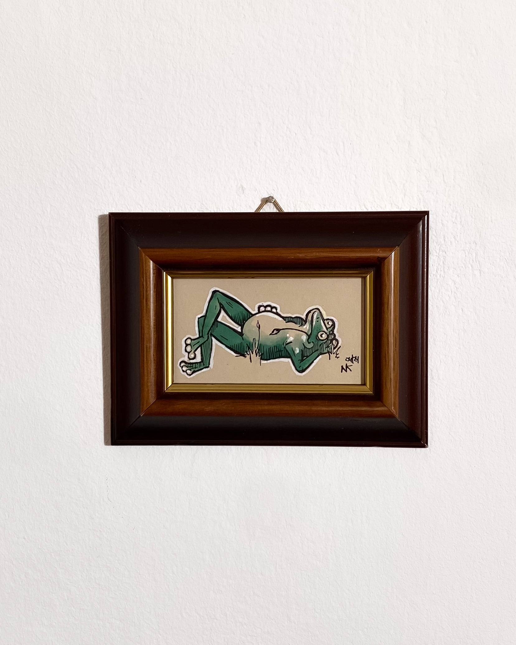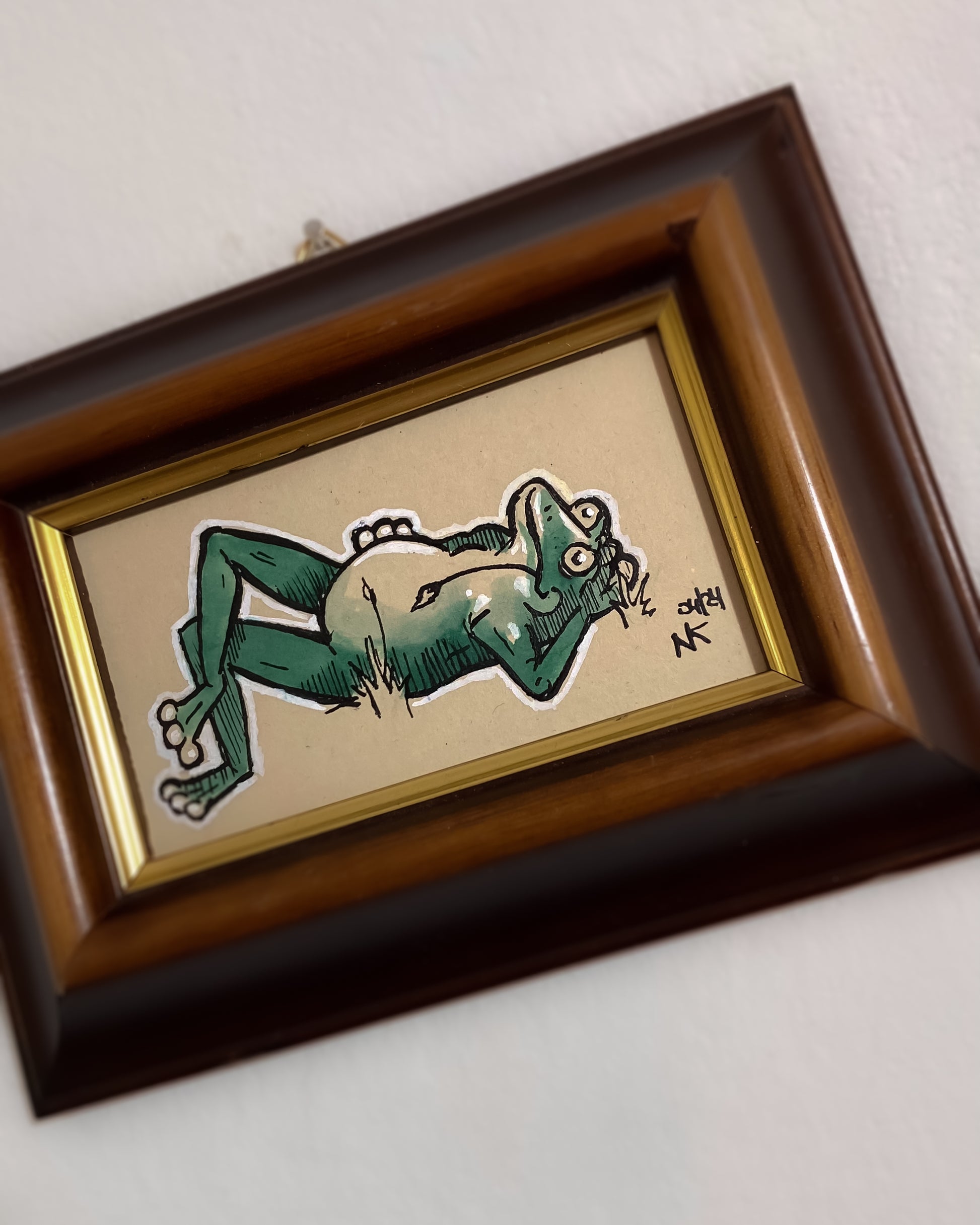 Calligraphy pen with acrylic and water-based ink on tan paper, vintage frame